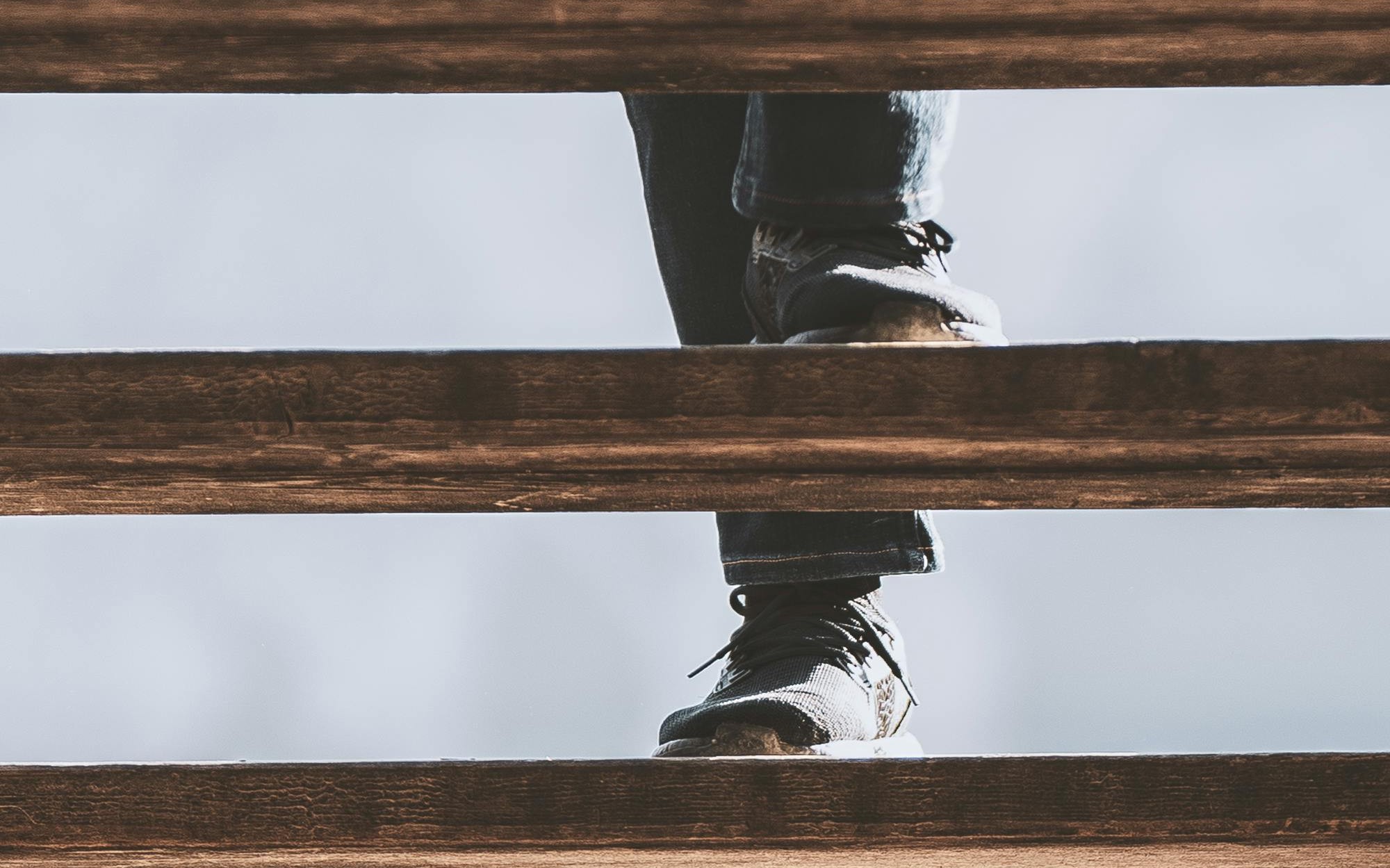 Person läuft Holztreppe hoch